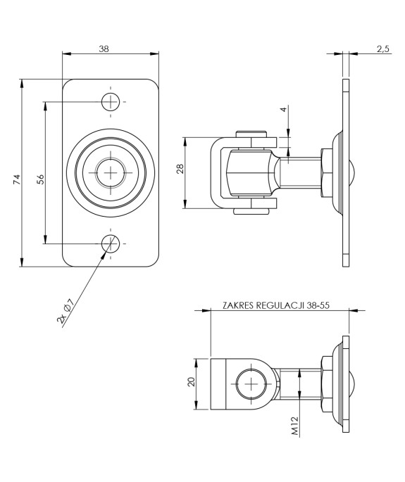 Stalowy zawias regulowany ze śrubą M12. Posiada szyld o wymiarach 75x38 mm z czterema otworami umożliwiającymi przykręcenie.